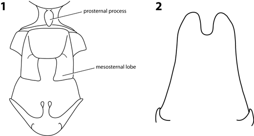 Mesosternum with the length of lateral lobes longer than their width (Fig. 1). Prosternal process always present (Fig. 1). Male subgenital plate always bilobed (Fig. 2). Usually moderate to large size [Entirely in New World except S. gregaria].............................................................................. 2, Schistocerca Stål |