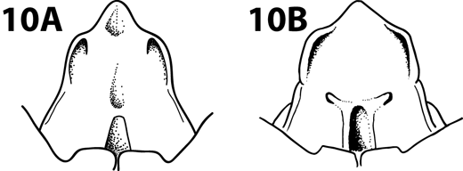 Apical lobes of male subgenital plate not flared outward (Fig. 9A,B) .............. 28 |
