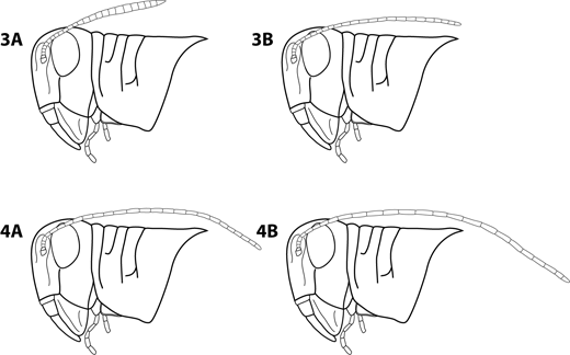 Antennae length, especially in males, long but not extending much beyond pronotum (Fig. 4A) .......................................................................................... 31 |