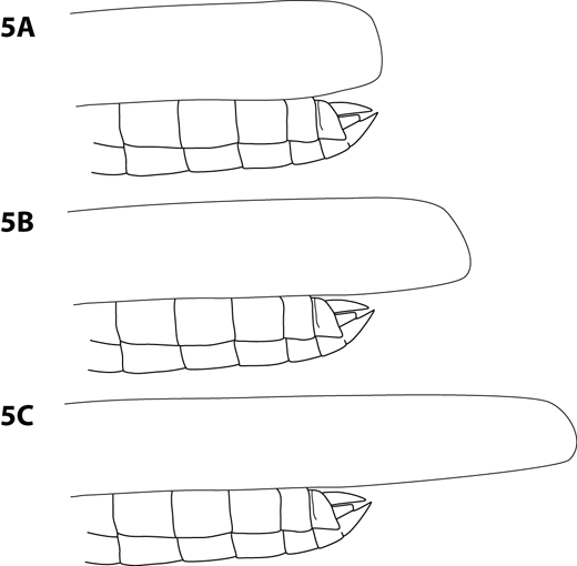 Length of tegmina only slightly extending beyond abdomen (Fig. 5B) .............. 5 |