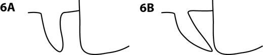 Pronotum without granules. Prosternal process straight or only slightly curved backward, never touching thoracic sternum (Fig. 6A). Tegmina with large brown maculation. Apical valve of cingulum rectangular and distinctly curved down. Male subgenital plate notch deep and angular. [Ecuador and Peru] .................................................................................... S. subspurcata (Walker) |