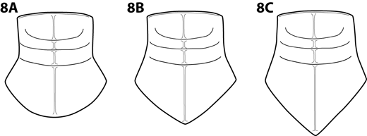 Posterior margin of metazona of pronotum broadly round (Fig. 8A) ............... 13 |