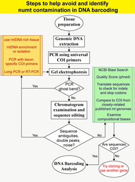 Nuclear mitochondrial pseudogenes (numts) are non-functional copies of mtDNA in the nuclear genome which have been found in the major clades of eukaryotic organisms. Among insects, Orthoptera, especially grasshoppers, are known to have exceptionally high numbers of numts although the exact mechanism for nuclear integration is not well understood. The presence of numts poses a challenge for PCR-based mitochondrial systematics because inadvertent coamplification or preferential amplification of numts can occur, thereby compromising the orthology assumption of characters. This line of research stemmed from my own struggle with generating mitochondrial sequences from grasshoppers, which has serendipitously transformed into an exciting area of research. My first approach was to document the effect of numt coamplification in mitochondrial systematics and as a case study, I examined the DNA barcoding initiatives, which relies on a portion of